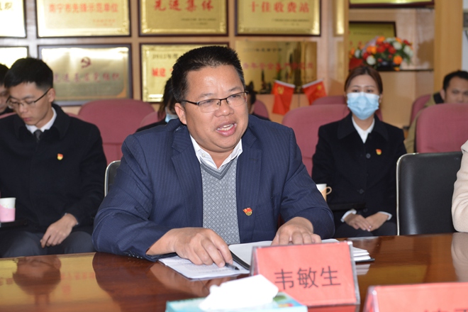 会上,韦敏生书记介绍了南宁路桥公司党总支部的党员情况及公司业务发展。他说,总支部目前有党员69人,下设党支部3个,分别为南宁城市路桥投资管理有限责任公司机关党支部、南宁中州投资有限公司党支部、广西路邦石化有限公司党支部。他表示,双方要以“双强六好”为目标开展党组织共建活动,充分发挥党组织的自身优势,拓展和完善党组织功能,定期交流党建工作经验,共享党建工作信息,提高党建工作水平。