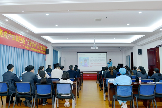 瑞康医院副主任医师黄清玉、龚斌为大家讲授应急救治的理论知识。他们通过多个生动的案例突出救命的黄金时间重要性,强调突发事件现场第一目击者(第一反应人)为伤病员提供心肺复苏操作的必要性,传播“人人学急救、急救为人人”的理念。他们以通俗易懂的方式深入浅出地讲解了应急救护理论知识、高质量心肺复苏(CPR)、自动体外心脏除颤器(AED)的使用、气道异物梗阻的处理方法,告诉学员们更好地解决“何时救、谁来救、怎么救”的问题,培养学员既要有见义勇为的意识,更要具有见义智为的知识和技能。