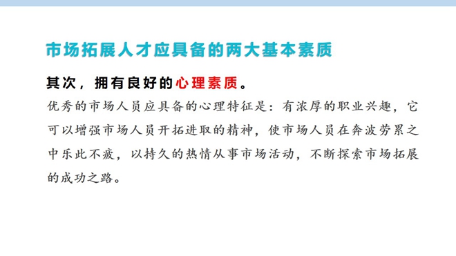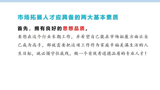 市场拓展人才专项培训则主要针对市场拓展人才应具备的基本素质和能力,市场拓展技巧,应酬的七大黄金法则,如何更好地建立客户管理体系。