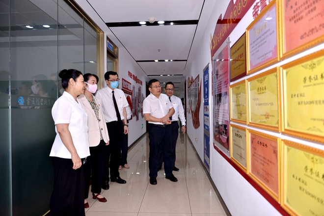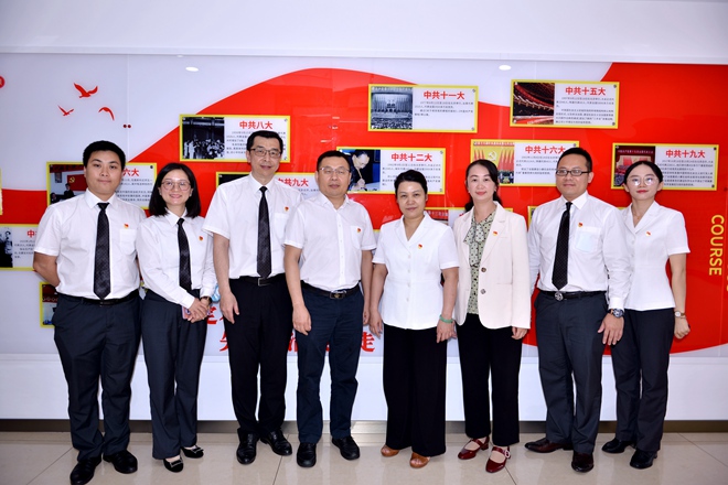 王镱霖总裁(左一)带领授课老师参观党建长廊