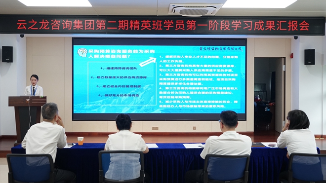 2022年5月23日,云之龙咨询集团人力资源部组织第二期精英班学员开展入职第一阶段学习成果汇报会。集团总裁王镱霖,副总裁韦明剑、韩俊以及集团人力资源部总经理秦誉珊作为评委出席会议。