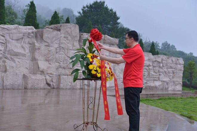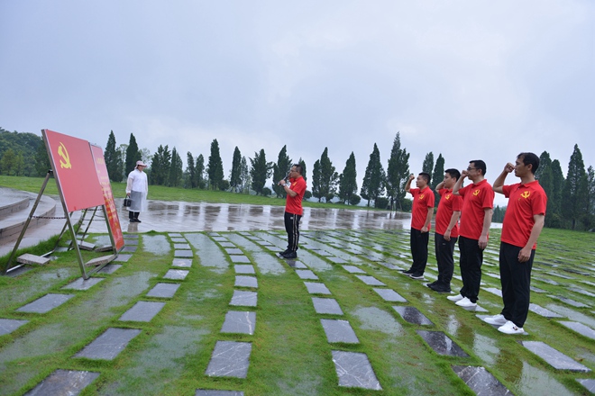 当天,湘江战役纪念园内青松苍翠,大雨磅礴。云之龙党总支部副书记韩俊、组织委员蒙舒芸、宣传委员蒋银亮,以及办公室党支部书记毛麒盛、玉林分公司党支部书记刘柱冒雨前来纪念园。大家怀着对革命先烈无比崇敬的心情,缅怀红军烈士雕像,向烈士雕像敬献花篮并默哀、三鞠躬。