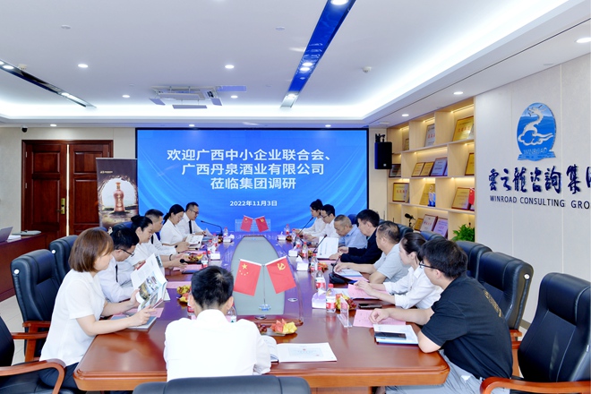 此次调研学习活动是在自治区工信行业联合党支部书记、广西中小企业联合会执行会长张杰的牵头下,河池市人民政府工业振兴特派员、广西丹泉酒业营销公司副总经理覃康平,广西丹泉酒业集团副总经理王丰全等一行到云之龙参观调研。云之龙咨询集团总裁王镱霖,副总裁莫国华、韦明剑一同参与调研会议。