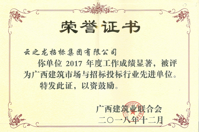 “2017年度广西建筑市场与招标投标行业先进单位”证书