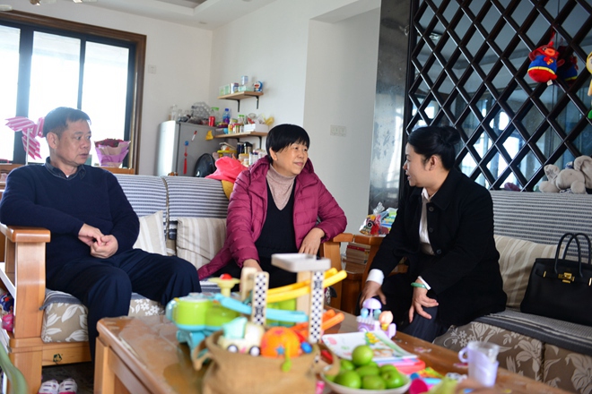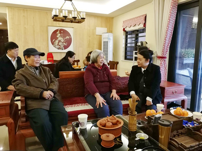 在南宁分公司员工刘诗施家里,王总裁拉着刘诗施母亲的手,亲切交谈,她说,十分感谢家属的付出,使得员工可以在集团前线努力打拼。刘诗施是一位非常优秀的员工,工作出色,每年承担大大小小项目上百个,为集团发展作出了很多贡献。