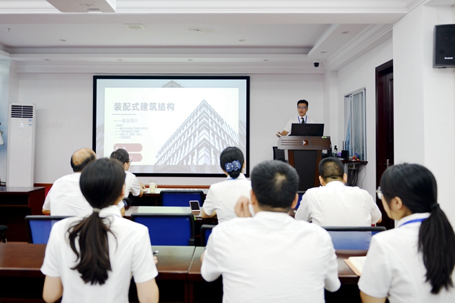 装配式建筑理论培训围绕国内外装配式建筑现状、装配式政策解读、方案评审要点、装配式现场展开,并重点强调了装配式建筑“四节一环保”的优点和造价相对较高的缺点。