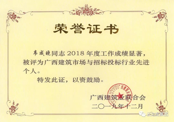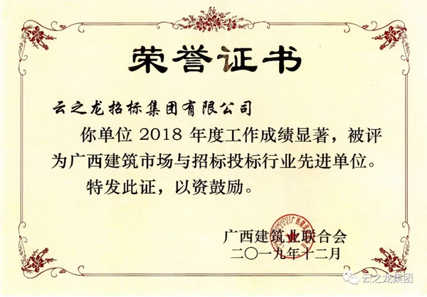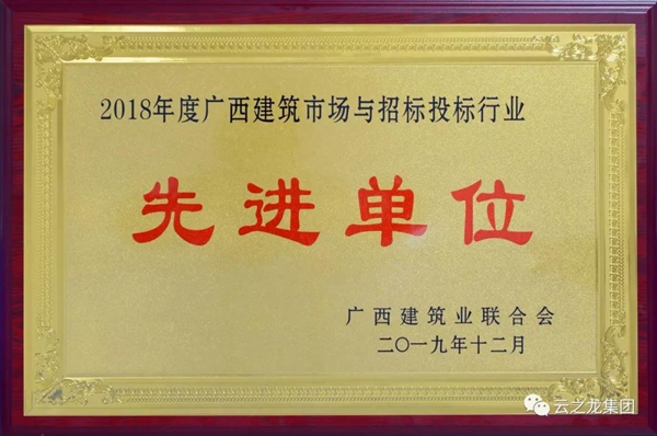 云之龙集团再次被评为“2018年度广西建筑市场与招标投标行业先进单位”,这是集团连续第九年获得此殊荣。此外,集团项目经理韦成晓获得“先进个人”称号。
